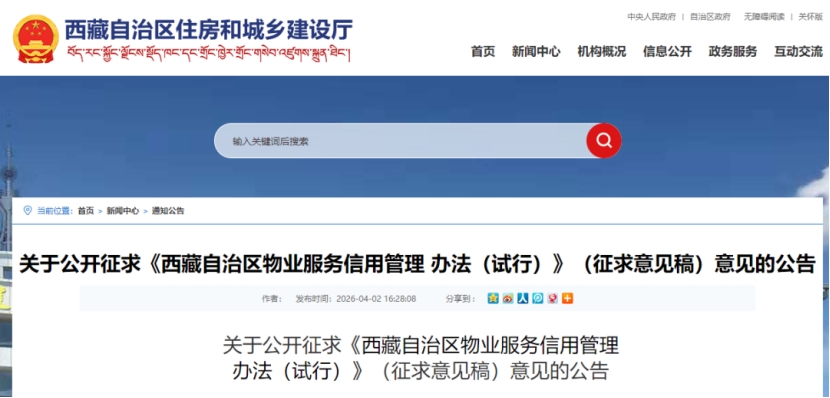 为建立健全我区物业服务行业信用管理体系,营造公平诚信的市场环境,促进物业服务行业健康有序发展,根据《国务院关于建立完善守信联合激励和失信联合惩戒制度 加快推进社会诚信建设的指导意见》《西藏自治区人民政府关于建立完善守信联合激励和失信联合惩戒制度 加快推进社会诚信建设的实施意见》等法律、法规的规定,结合西藏自治区实际,西藏自治区住房和城乡建设厅起草了《西藏自治区物业服务信用管理办法(试行)(征求意见稿),现公开向社会征求意见,欢迎社会各界提出宝贵意见和建议。